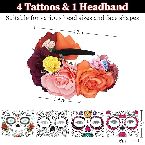 4 Kits Day of the Dead Sugar Skull Temporary Face Tattoos Makeup Costumes for Women and Men, DIY Skeleton Face Tattoos with 1 Rose Red Flower Crown Headband for Halloween Party Cosplay Supplies