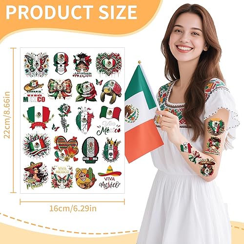 Mexican Independence Day Temporary Tattoos - 60+ Mexico Party Decorations Supplies, Patriotic Party Favors Fake Tattoo for Kids Boys Girls, School Prize (8 sheets)