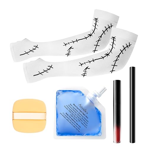 Sally Makeup Kit - Light Blue Face Paint, Scars Stitches Arm Sleeves, Black Liquid Eyeliner, Red Lipstick, Powder Puff - Halloween Sally Cosplay Costume Accessories for Women, Girls, Adults & Kids