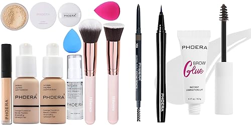 PHOERA Foundation,Full Coverage Foundation,PHOERA Primer,PHOERA Powder,PHOERA Concealer PHOERA Makeup Set,PHOERA Eye Makeup Kit, Include Eyebrow Pencil,Eyeliner and Eyebrow Gel Clear
