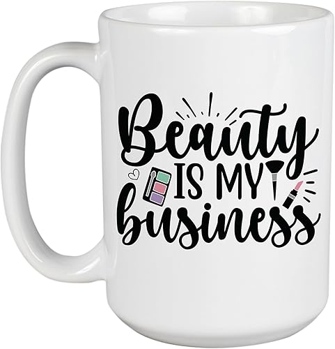 Beauty Is My Business with Eyeshadow Palette, Brush & Pink Lipstick Design - Beauty Themed Merch for Makeup Artist or Cosmetologist, Gift for Makeup Lovers & Beauticians, White Mug 15oz