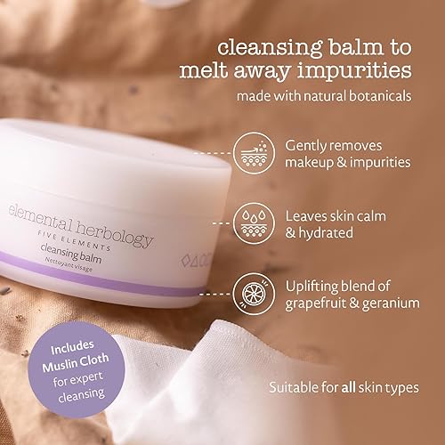 Elemental Herbology 5 Elements Cleansing Balm – Makeup Removing & Hydrating Balm with Sea Buckthorn, Apricot & Jojoba Oils – Gentle Face Cleanser with Grapefruit & Geranium + Muslin Cloth