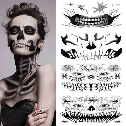 Fake Zombie Face Tattoos for Halloween Makeup Kit, Day of the Dead Skull Face Tattoos Halloween Costume Prank Temporary Tattoo for Women Mens