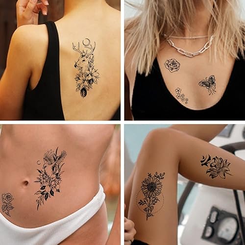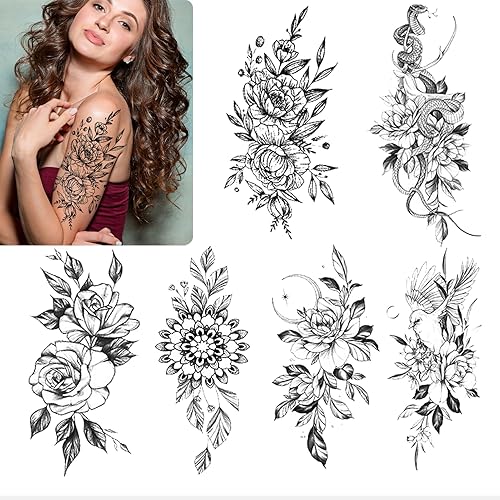 12 Sheets Black and White Flower Temporary Tattoos for Women and Girls Fake Tattoo Stickers