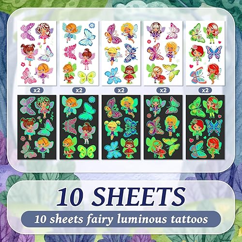 EMOME 40 Styles Luminous Butterfly Birthday Party Decorations Favors Supplies, Glow Butterfly Tattoos Temporary for Fairy Birthday Party Decor, Fairy Stickers for Butterfly Toy (10 Sheets)