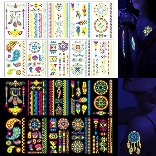 Glow in the Dark Tattoos 80 PCS Glow in the Dark Party Supplies, Neon Body Paint Be UV Blacklight Reactive Face Temporary Tattoo for Adults, Teens Neon Accessories Party Favors Decorations Q746