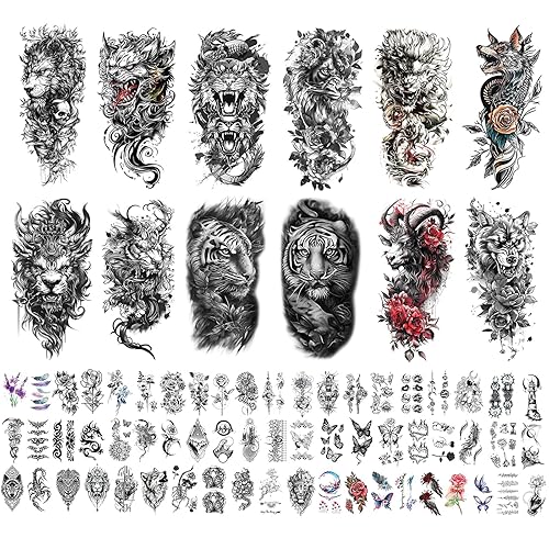 72 Sheets Temporary Tattoo for Men Women Adults, Include 12 Sheets Half Sleeve Temporary Tattoos, Halloween Tattoos Scary Lion Wolf Tiger Skull Skeleton Tattoos Stickers (style 2)