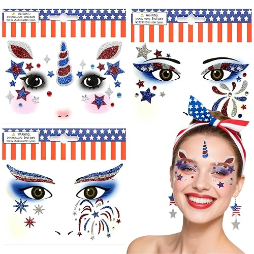 1 Sheet 4th of July Face Gems Blue Face Jewels Stick on Face Heart USA Flag Rhinestone Eye Gems Face Stickers for Women, Body Eyes Face Tattoos Sticker for Independence Day Party Festival Accessory