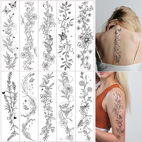 Realistic Wild Flower Temporary Tattoo for Women Back, Long Black Plant Leaf Floral Fake Arm Tattoo Sticker Adult Girl Spine, Sexy Butterfly Botanical Temp Tatoo Leg Waist Thigh Body Makeup, 10-Sheet
