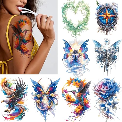 8 Sheets 3D Watercolor Half Sleeve Flower Butterfly Temporary Tattoos Adults, Waterproof Floral Stickers Women Men, LongLasting Rose Eagle Bird Agle Tattoo for Parties Festivals Styling Accessories