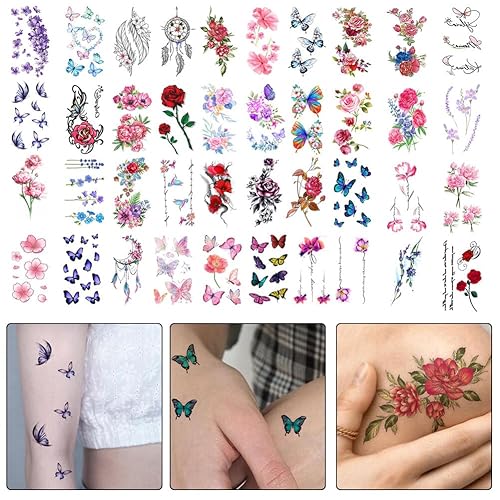 40 Sheets Flower Tattoos for Kids Girls Women Butterflies Flowers Temporary Tattoo Stickers Small Waterproof Flower Tattoos Temporary Realistic Fake Tattoo Stickers for Arm Face Neck Leg Hand