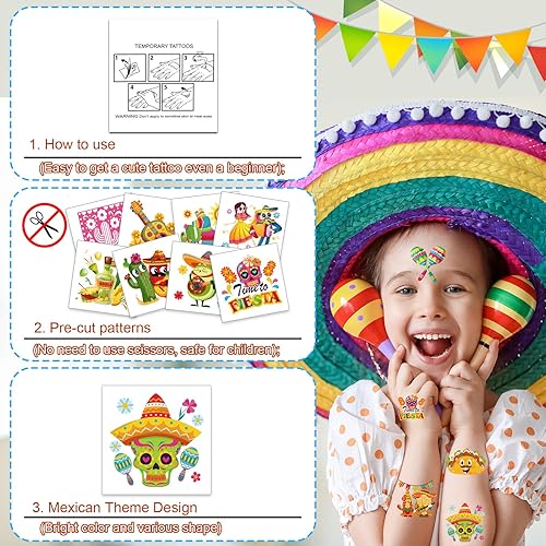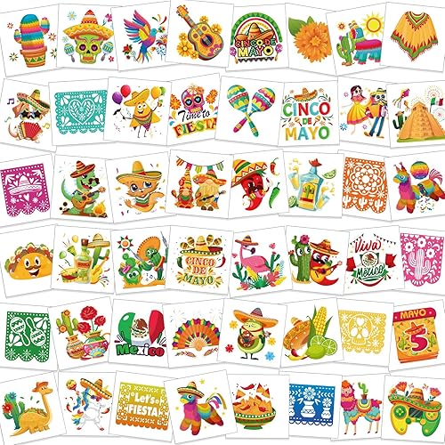 HOWAF 96 Pcs Mexican Cinco De Mayo Temporary Tattoos, 48 Styles Mexican Fiesta Party Supplies Tattoos for Birthday Cinco De Mayo Face Body Waterproof Tattoos Stickers for Mexican Party Decorations