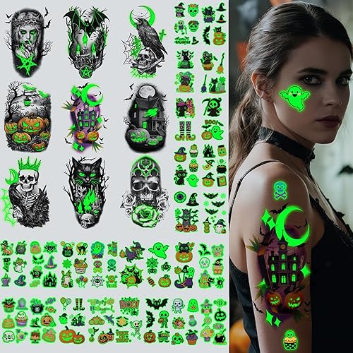 Halloween Glow Temporary Tattoos for Kids Adults, Glow In the Dark Tattoos, Pumpkin, Skull, Bat, Ghost, Witch, Crow, Cat, Horror House Half Arm Halloween Fake Tattoos Decorations