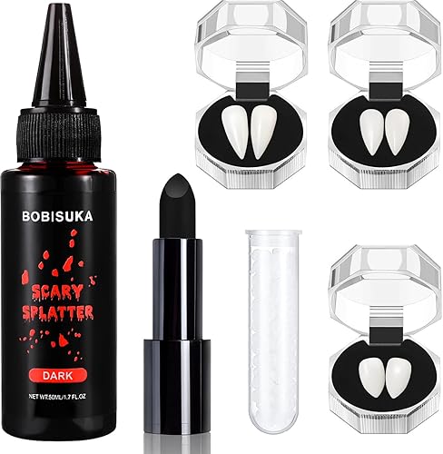 BOBISUKA Halloween Vampire Makeup Kit with Dark Fake Blood, Black Lipstick, 3 Pairs Vampire Teeth, Horror Cosplay Costume Accessories for Halloween, Vampire, Party