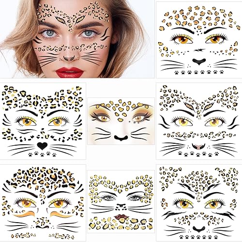 7 Sheets Leopard Face Tattoo Stickers Glitter Cheetah Print Temporary Tattoos Women Body Makeup Accessories for Halloween Costume Party