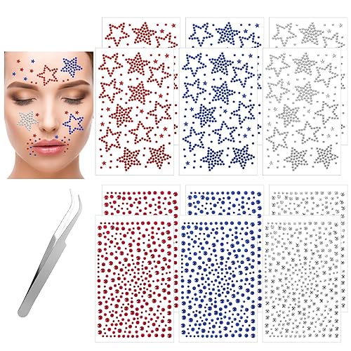 Face Gems Face Jewels, 12 Sheets Red Blue Clear Festival Jewels Self Adhesive Crystal Star Sticker for Eye Makeup Body Rave Accessories for Halloween Makeup Costume Parties Festival Looks
