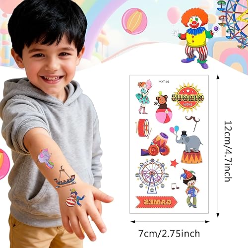 Konsait 10 Sheets Carnival Tattoos, Colorful Fun Games, Clowns, Circus Animals & Balloons Carnival Temporary Tattoos for Parties, Prizes, Birthday and Festivals