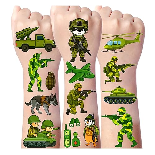 8Sheet - 110PCS Military Camo Temporary Tattoos for Kids – Cartoon Fake Tattoos Stickers for Birthday Party Favors, Gifts, DIY Decoration & Fun Activities – Waterproof & Skin-Safe