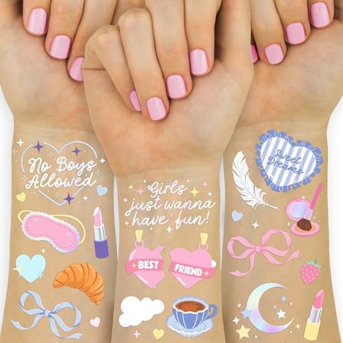 xo, Fetti Sleepover Temporary Tattoos - 72 Iridescent Foil Pcs | Birthday Decorations, Girls Pajama Night Accessory, Cute Kids Activity, Slumber Party Favor