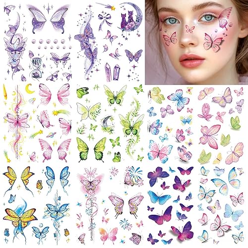 10 Sheets Butterfly Temporary Tattoos Women Fake Colorful Wings Flower Art Waterproof Stickers Birthday Party Face Body Arm Makeup Supplies