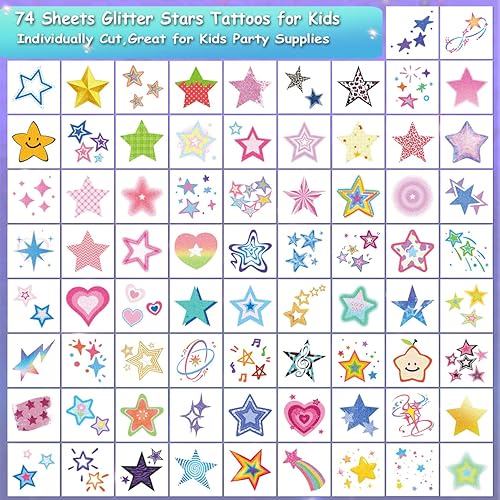 Glitter Stars Temporary Tattoos for Kids - 74 Individually Sheets | Waterproof & Easy Peel | Perfect for Kids Birthday Party Favors, School Rewards