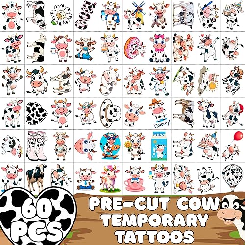 Cow Temporary Tattoos | Cute Cow Birthday Party Decorations Stickers Party Favors Supplies Accessories Décor Gift Idea For Kids Boy Girl Teen Adult 60Pcs 4 Sheets Pre-cut
