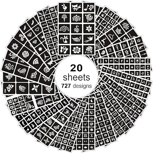 20 Sheets Temporary Tattoo Stencils for Women Girls and Kids, 727 PCS Henna Tattoo Stencil Kit,Temporary Indian Arabian Glitter Airbrush Tattoo Stencils for Face Body Paint DIY