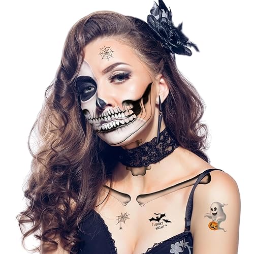 VERKSTAD Halloween 6 Sheets Skull Face Tattoo, Scary Mouth Tattoo Stickers, Horror Skeleton Vampire Death Demon Zombie Temporary Tattoos, 8 Small Pumpkin Tattoo Costume Makeup Cosplay Accessories