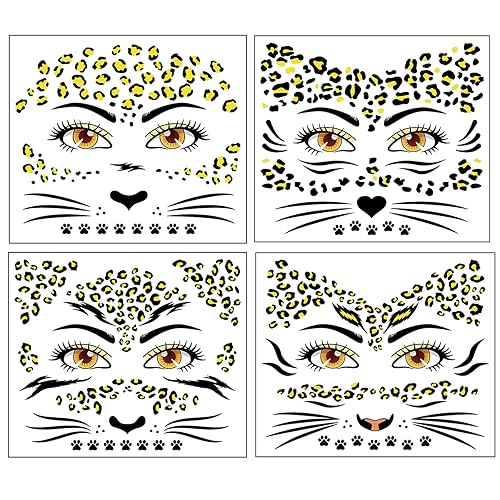 4 Sheets Leopard Face Temporary Tattoos Stickers Gold Cheetah Cat Body Face Tattoo Makeup Accessories for Women Girls Halloween Makeup for Parties