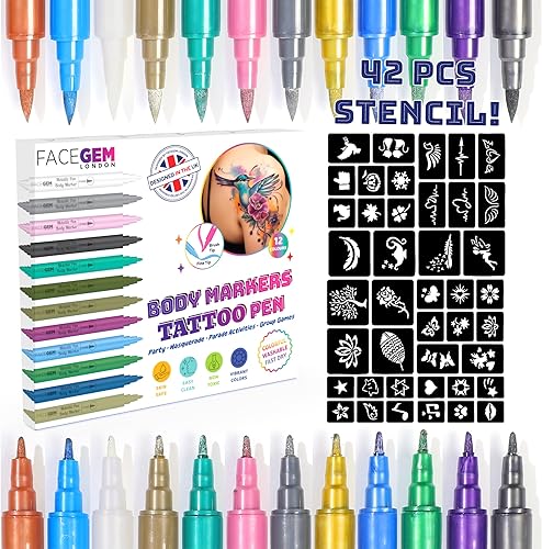 12 Metallic Temporary Tattoo Markers – Create Temporary Tattoos with Dual-Tip Body Markers, Bold & Fine Lines, Waterproof, Fast-Drying, Non-Toxic, 42 Stencils, Fake Tattoos Set, Tattoo