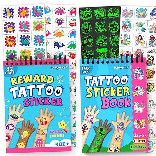 PARTYWIND 1 Pack Reward & 1 Pack Regular Tattoo Sticker Book, Mixed Styles Tattoo Stickers for Kids, Prizes for Kids Must Have Essentials for School Teacher Home Supplies