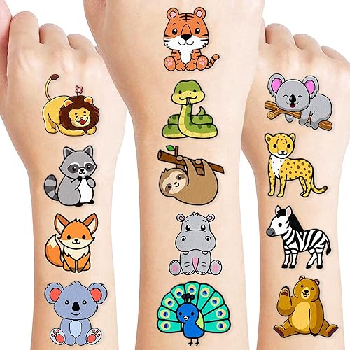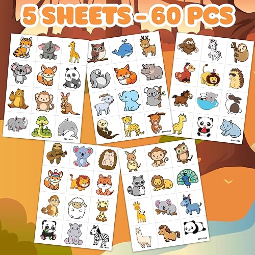 Zoo Temporary Tattoos – 5 Sheets 60 PCS Safari Jungle Animals Birthday Party Favors, Cute Stickers for Kids Boys Girls, Classroom School Prizes, Carnival and Holiday Gifts