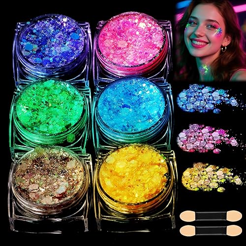 6 Colors Glow in The Dark Glitter Gel for Face Body and Hair, UV Black Light Makeup Glitter Gel for Raves Festivals Party Halloween (Type 1)
