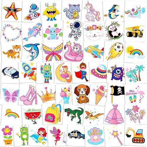 52 Piece Kids Temporary Tattoos, Individually Wrapped tattoo, Unicorn Mermaid Dinosaur Outer Space Animal Tattoo Stickers