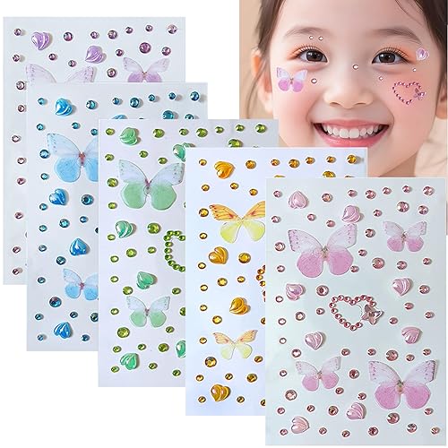 5 Sheets Butterfly Face Stickers for Girls & Teens, Self-Adhesive Rhinestone Gems - Sparkle Face & Body Jewels for Birthday Party, Princess, Festival, Slumber Party, Halloween Costume, Kids Makeup