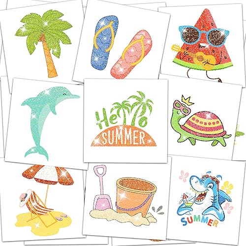 120 PCS Glitter Summer Temporary Tattoos for Kids, Hawaiian Luau Party Favors Tropical Waterproof Stickers for Pool Beach Tattoo, Summer Beach Party Decoration Supplies