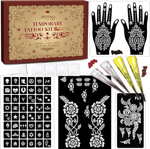 128 pcs Temporary Stencils Tattoos Kit, 8 Pcs Tattoo Cones 3 Color (2 Black 3 Maroon 2 Cherry Red) with Gloves Brush Tool,DIY Body Art Skin Painting Designs for Adults Kids Party Gifts