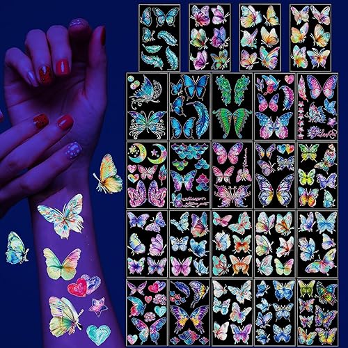 Fluorescent Butterfly Temporary Tattoos,24 Sheets Neon UV Reactive Butterfly Transfers Fake Tattoos for Women Girls Face Body Art Rave Festival Glow in Dark Party Favors Supplies
