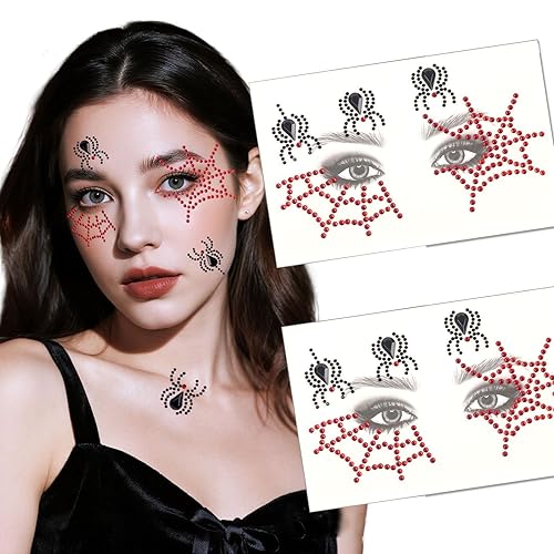 2Sheets Red Spider Web Face Jewel Sticker, Halloween Gem Face Stickers,Black Spider Diamond Stickers,Self-Adhesive Face Eye Art Accessories for Halloween Cosplay Festival Gift Supplies