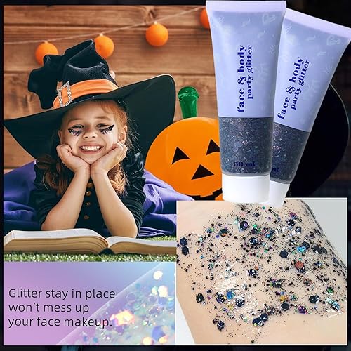 Halloween Body Glitter Gel, Halloween Black Chunky Glitter Gel for Face Hair Body Makeup, Cosmetic Face Paint Sequins for Halloween Party SFX Makeup Rave Accessories, 50ml