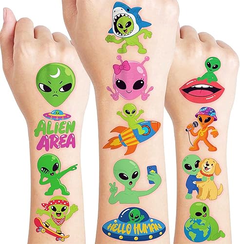 96 PCS Cute Alien Pre-Cut Temporary Tattoos for Kids | Super Cute Alien Space Planet Themed Birthday Party Favors, Supplies, Decorations, Fake Tattoo Stickers, School Rewards & Gifts for Boys Girls