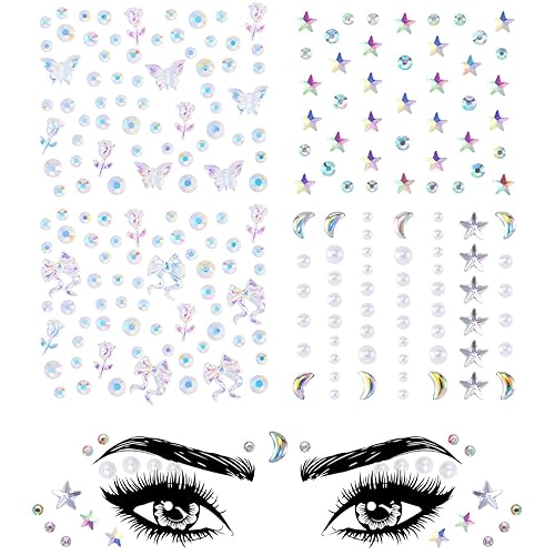 4 Sheets Star Face Eye Stickers, Crystal Face Gems, Acrylic Star Body Sticker, Moon Pearls Butterfly Makeup Stickers, 4 Styles Rhinestone Tattoos for Women, Girls