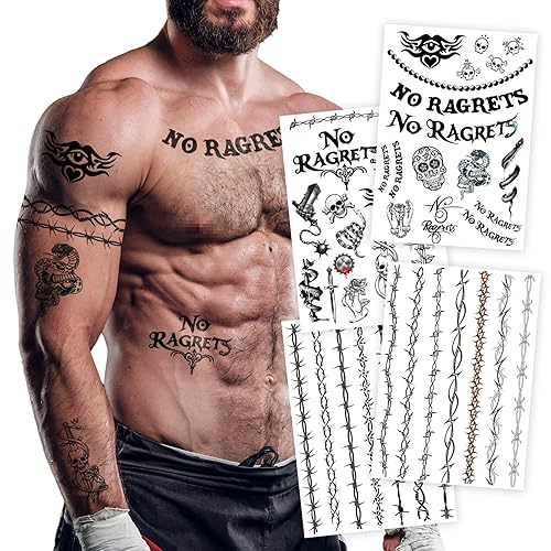 No Ragrets & Barbed Wire Halloween Temporary Tattoos 4 Sheets - Realistic Tattoo Stickers Arm Bands, Spine & Neck Costume for Scary Funny Adult Women Men Parties