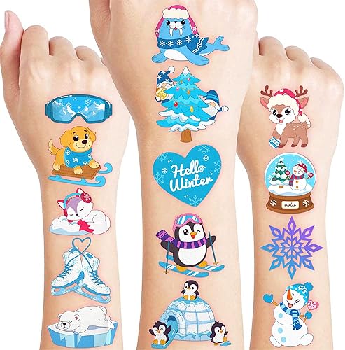 96 PCS Hello Winter Snowflake Pre-Cut Temporary Tattoos for Kids | Super Cute Themed Birthday Party Favors, Supplies, Decorations, Fake Tattoo Stickers, School Rewards Prizes & Gifts for Boys Girls