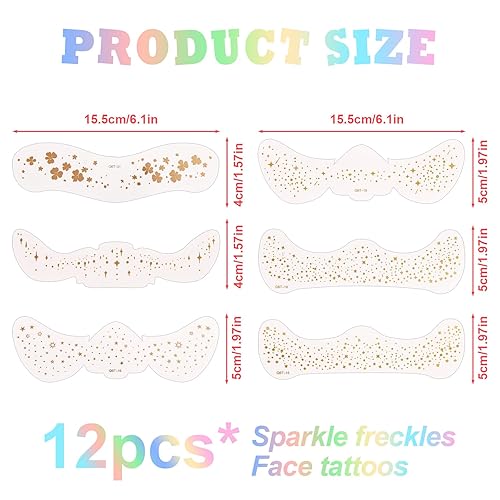 12pcs Gold Freckles Temporary Face Tattoos, 6 Design Sparkle Makeup Patches Waterproof Glow Up Face Glitter Speckles Cosmetic Stickers for Women Makeup Festival Dancing Carnival Party
