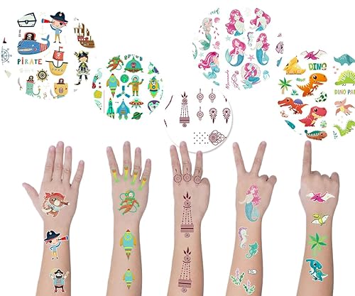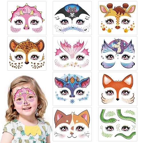 Konsait 10 Sheets Glitter Face Tattoos for Kids Animal Fake Tattoos for Girls Boys Face Makeup Tattoo Mermaid Bat Dinosaur Temporary Face Tattoo Birthday Halloween Makeup Stickers Party Favors