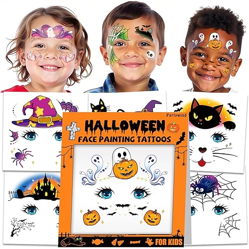 Partywind Halloween Temporary Face Tattoos for Kids, Fake Tattoo Stickers with Pumpkins Ghosts for Kids Halloween Party Decorations Supplies Treats, Games Goodie Bag Stuffers for Boys Girls