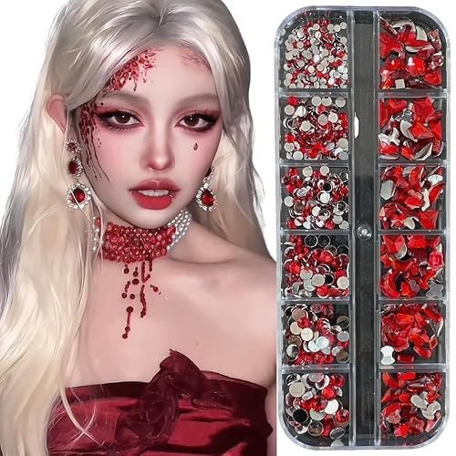Face Gems Stick on Jewels Tattoos for Women Halloween Cosplay Makeup, Red Rhinestones Gems Multi Shapes Flatback Crystals Face Nail Art Charms s for Halloween Carnival Day of the Dead Party
