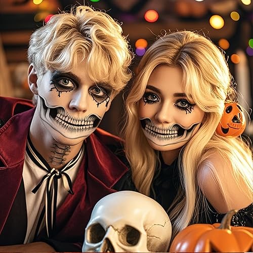 Leesgel Halloween Decorations- Skeleton Face Temporary Tattoos with Self Adhesive Face Gems Perfect for Halloween Costumes, Makeup, Party Favors, Stickers, Goodie Bag Stuffers for Women & Men, Adults