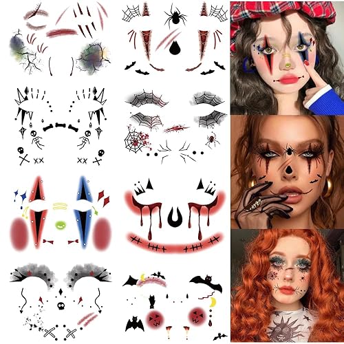 16 Sheets Halloween Temporary Face Tattoos, 8 Styles Cute Makeup Tattoos Stickers for Adults and Kids, Ghost Skull Witch Spider Clown